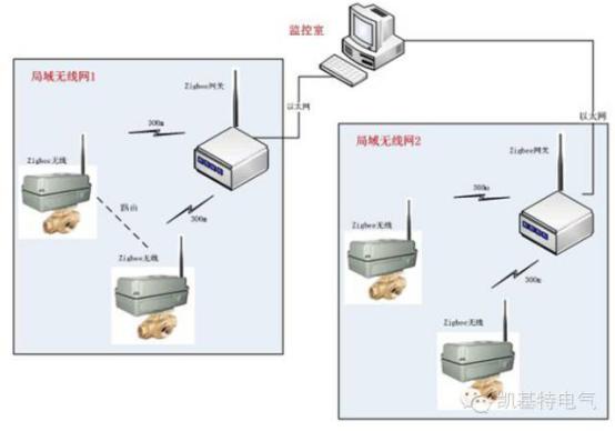 (1)如上圖所示,以Zigbee網關為KJT-SmartWireless無線主控節點,結合無線閥門裝置,共同組建了無線Mesh網絡,實現了數據的互聯互通,并以以太網的方式匯聚到監控室。