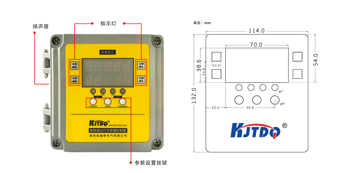 控制器功能主要是開機(jī)自檢功能,將激光傳感器接收到的信號進(jìn)行處理和計(jì)算,根據(jù)檢測到的距離,作出相應(yīng)的機(jī)電動(dòng)作(語音報(bào)警和PLC控制)。可在0.5-35m的量程任意設(shè)定兩個(gè)距離作為減速和停車,安裝在司機(jī)室或電氣室梁內(nèi):控制器的功能主要是將激光傳感器接收到的信號進(jìn)行處理,根據(jù)檢測到的距離,作出相應(yīng)的繼電器報(bào)警和減速,停車動(dòng)作,具有報(bào)警及語音提示等功能。