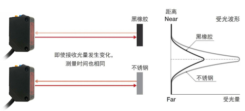 TOF方式是根據時間差來測量距離的,所以不受工件顏色、材質的影響。因此、更換工件時無需任何調整便可穩定感應。