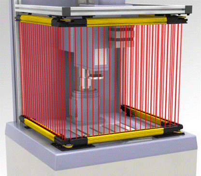 光幕保護裝置通過發射紅外線,產生保護光幕,當光幕被遮擋時,裝置發出遮光信號,控制具有潛在危險的機械設備停止工作,或控制報警裝置發出報警信號,以達到安全保護的目的。